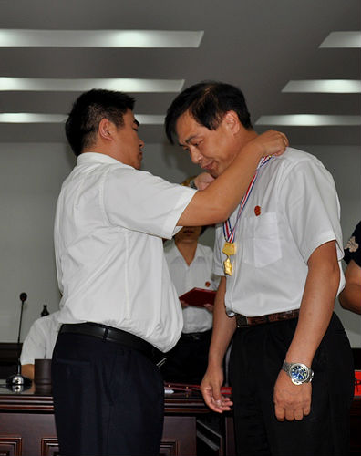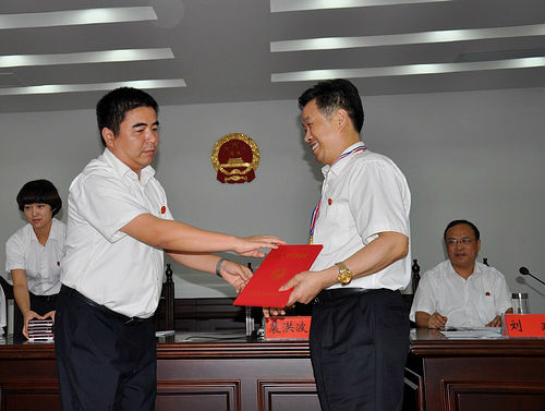7月17日下午,孝昌法院党组书记、代院长肖中兴为我院石继登、裴洪波、李爱国三位同志颁发“荣誉天平奖章”。