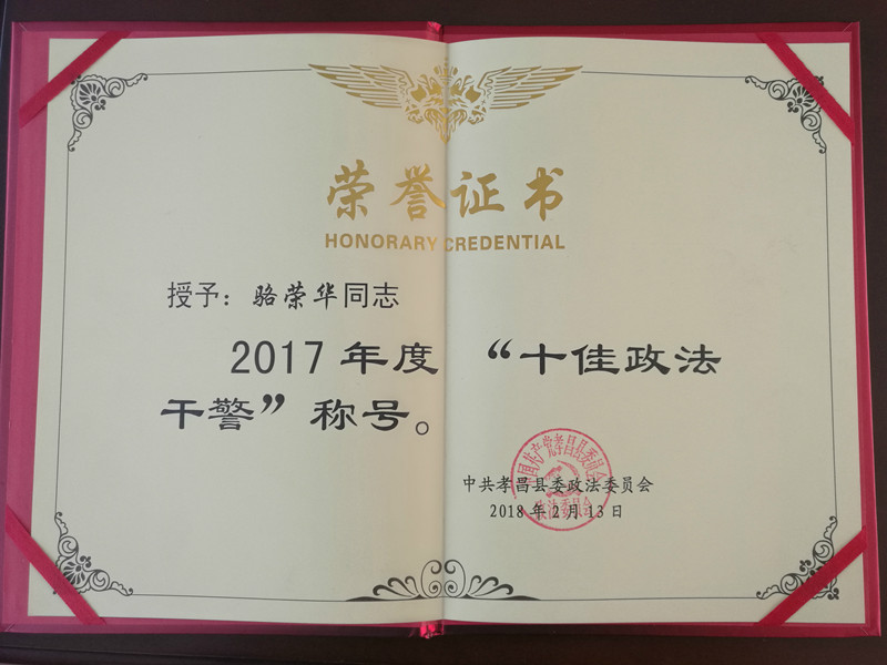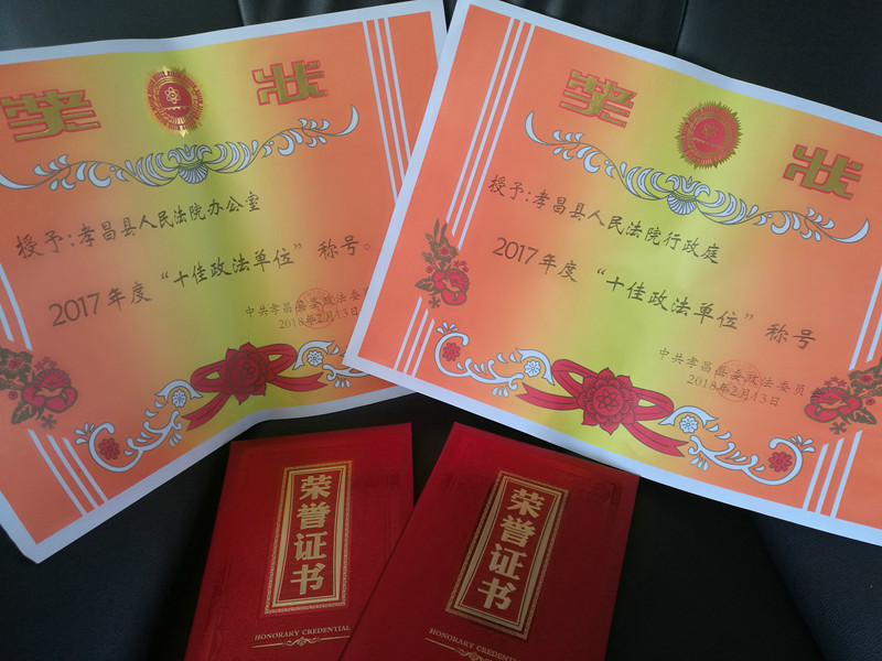 热烈祝贺孝昌县人民法院办公室、行政庭被授予2017年度“十佳政法单位”称号;骆荣华、刘国民同志被授予2017年度“十佳政法干警”称号。