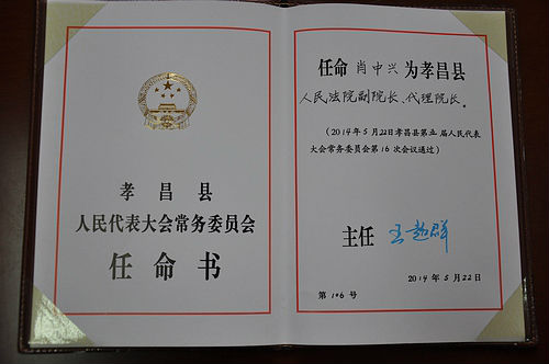 5月22日,孝昌县第五届人民代表大会常务委员会第十六次会议召开,会议高票表决通过了肖中兴为孝昌县人民法院代理院长;县人大常委会主任王超群为肖中兴颁发了任命书。