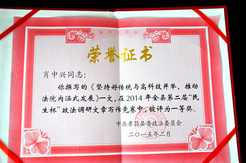 一年来,孝昌法院在各级媒体发稿163篇,其中:国家级23篇,省级20篇,市级101篇,县级19篇;市电视台录制《天平在线》4期、《法治孝昌》5期;法院服务中心、能动司法的经验做法在《孝感日报》、《湖北法治》、《孝昌工作简报》整版推介,广泛开展弘扬了主旋律,提升了法院公信力;孝昌法院被表彰为2014年度全县党委信息工作先进单位、院长肖中兴撰写《坚持好传统与高科技并举。推动法院内涵式发展》一文在全县第二届“民生杯”政法调研文章写作竞赛中,被评为一等奖。孝昌法院较好地完成了全年的信息宣传工作任务,让民众更多地了解了法院工作,为宣传法律、推进法治贡献了力量。